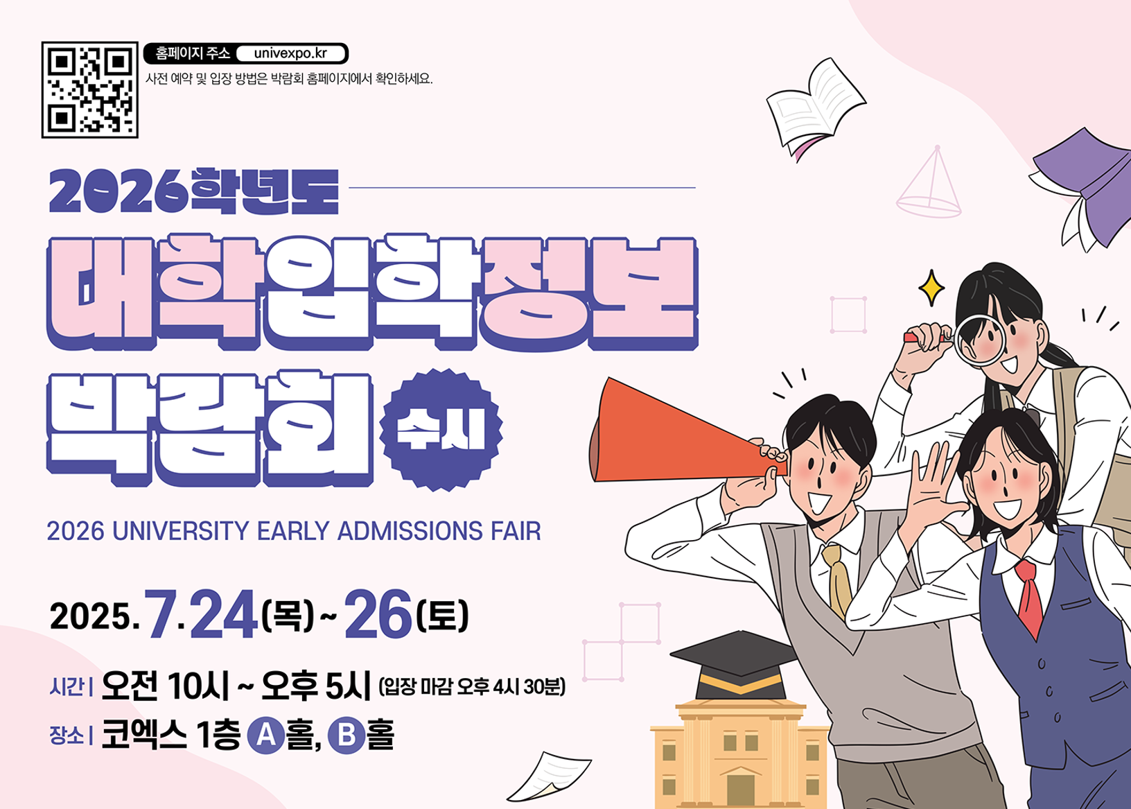 수시 원서 접수 전, 합격 가능성을 현실적으로 점검할 수 있는 기회가 있습니다. 2026학년도 수시박람회가 7월 24일(목)부터 26일(토)까지, 서울 코엑스에서 열립니다.