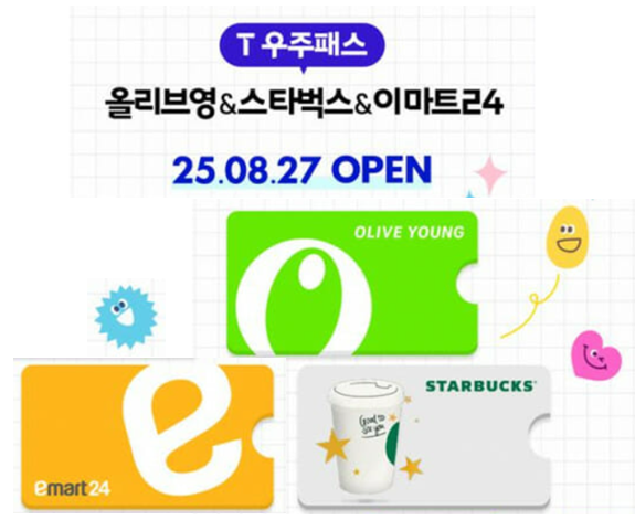 SK텔레콤이 8월 27일부터 T 우주에서 생활밀착형 구독 상품 **‘T 우주패스 올리브영&스타벅스&이마트24’**를 선보입니다. 월 9,900원으로 세 가지 인기 브랜드 혜택을 한 번에 누릴 수 있습니다.